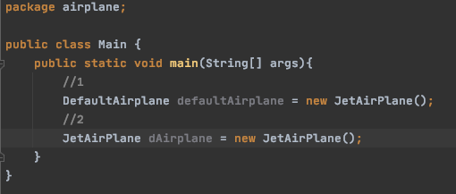 main함수 5번째 줄:(defaultAirplane 변수의 인터페이스인 에서의 인터페이스는 자바에서의 인터페이스와는 다른,임의로 정한 의미이다.)