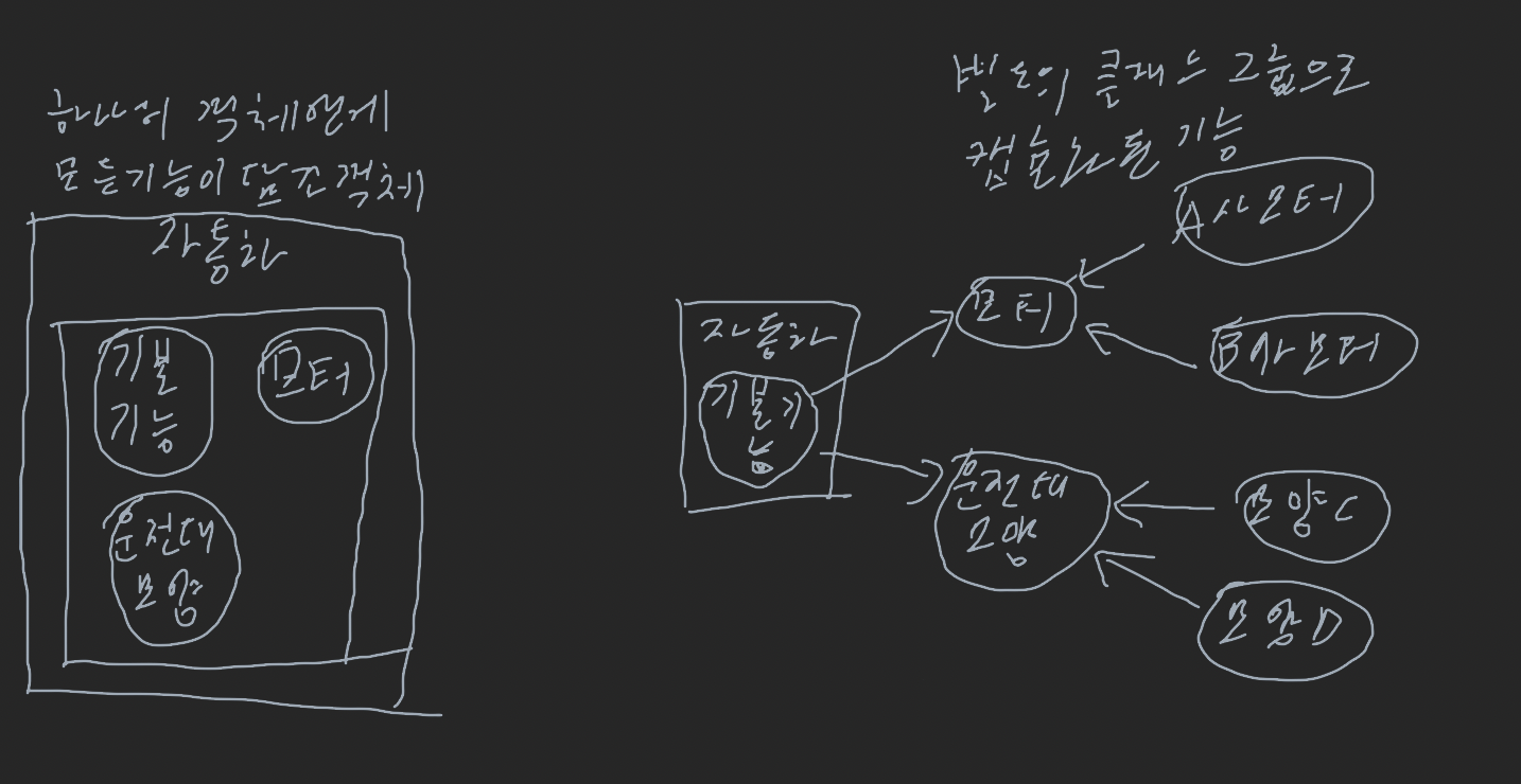 객체의 일부 기능을 다른 클래스 그룹의 새로운 틀로 담았기 때문에 이렇게 객체의 기능을 별도의 클래스 그룹으로 분리해 담으면, 프로그램의 유연성과 확장성이 좋아진다. 하나의 클래스에 기능을 모두 담아버리면 그 기능에 대한 확장이 어려운 반면 객체의 기능을 별도의 클래스 그룹으로 분리하면 그 기능을 더 확장할 수 있다.